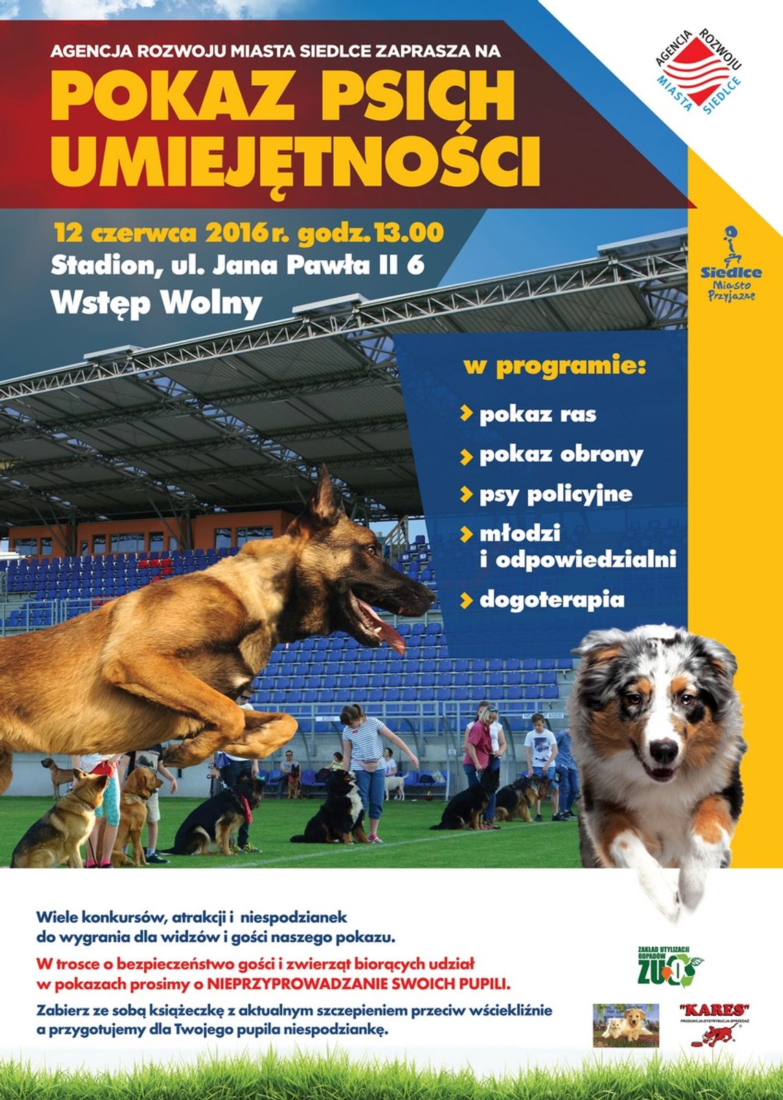 12 czerwca 2016 roku na stadionie piłkarskim przy ul. Jana Pawła II 6 w Siedlcach odbędzie się POKAZ PSICH UMIEJĘTNOŚCI. Wstęp wolny!